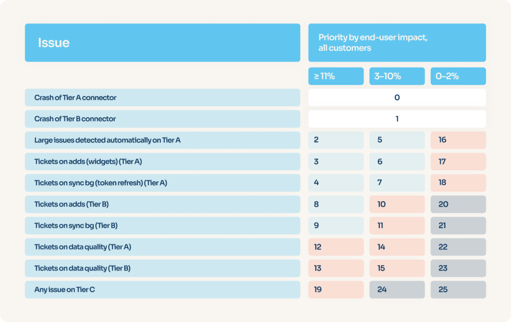 Now let’s mix it all together. There are the easy cases. Say that a Tier A connector has a problem that prevents all users from adding new accounts – this connector accounts for 15% of our total traffic. No one is going to argue whether we should attribute a high priority to this issue.