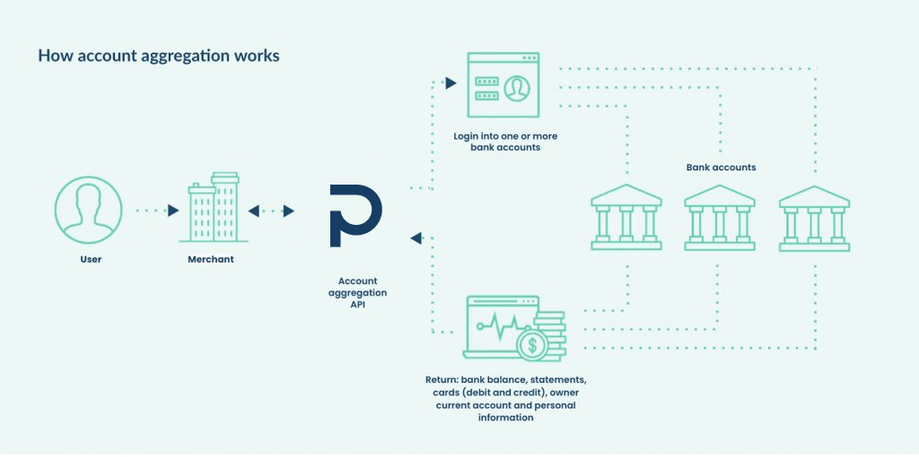 Aggregation is a technology that enables lenders to connect to several financial accounts of a loan applicant and feed them all through one API. With aggregation, the lender can integrate into a borrower’s checking account, savings account, and loan account and view all the relevant information on one dashboard.
