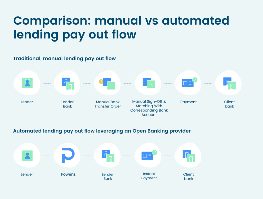 With Open Banking, lenders can push a payment directly from their account. Yes, it’s just like a bank transfer, except that it can now be triggered by a licensed third party (no more manual payouts!).